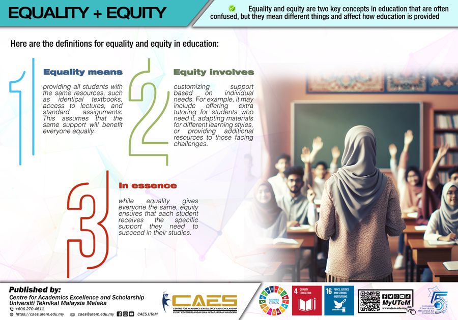 Equity focuses on fairness by recognizing and addressing the unique needs and circumstances of individuals. It involves adjusting resources and opportunities to ensure that everyone has a genuine and equal opportunity to succeed.